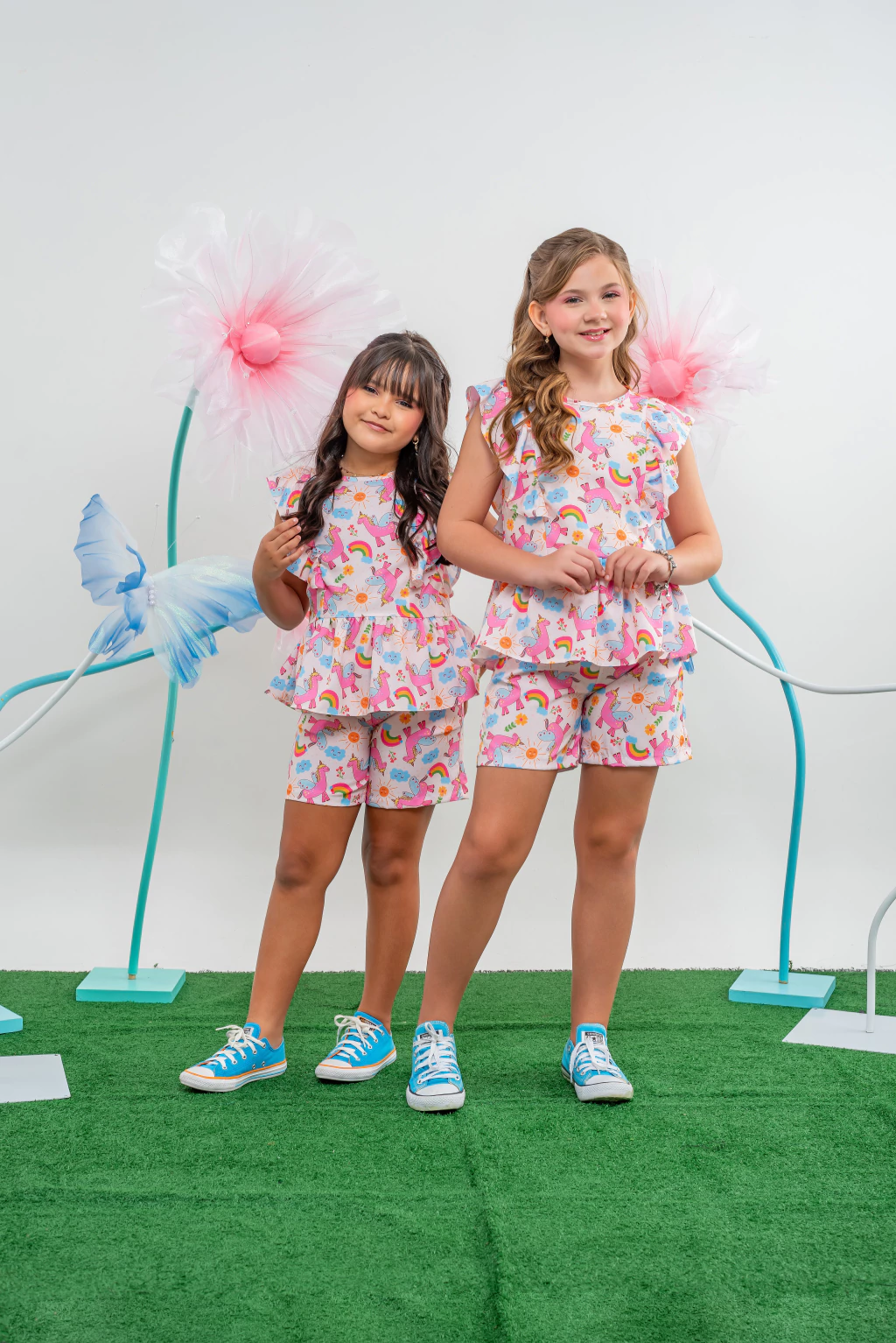 O conjunto traz blusa com babadinhos nas mangas e leve peplum, que deixa o visual gracioso, e short soltinho, perfeito para acompanhar a energia da infância.