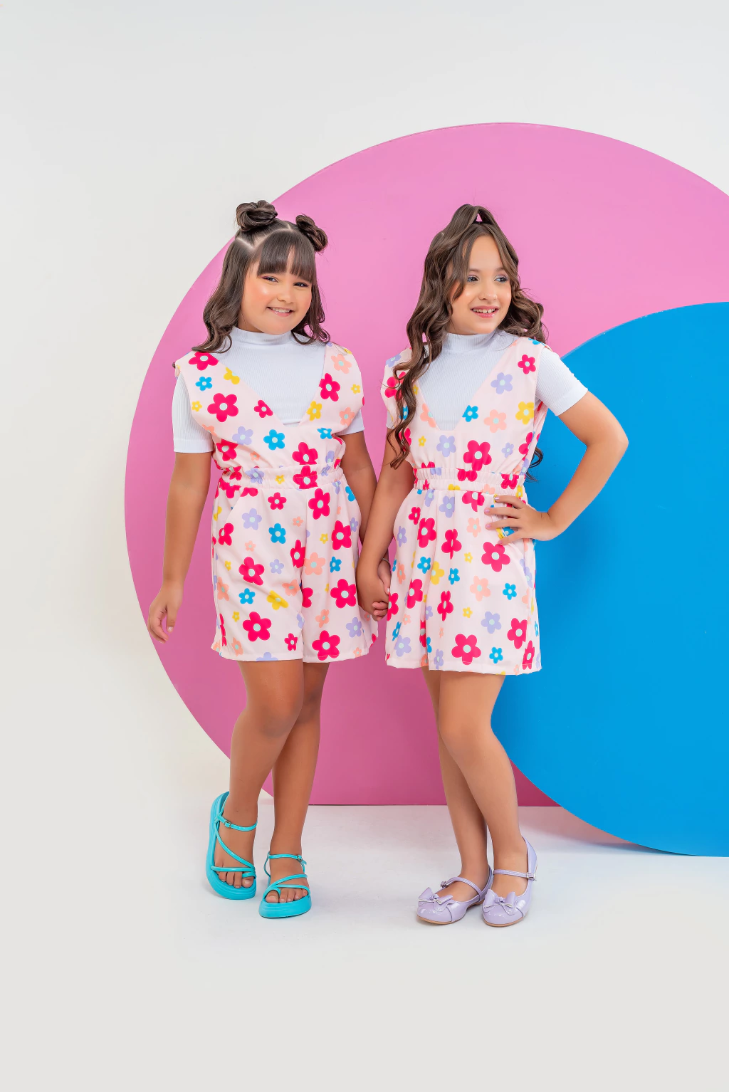 Com design que lembra uma salopete estruturada, o macaquinho tem modelagem diferenciada, com duplo tecido e ajuste em elástico, garantindo caimento impecável e ajuste perfeito ao corpo da criança — tudo com aquele toque de elegância que faz brilhar nas vitrines!