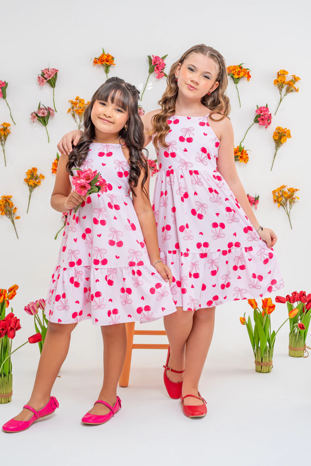 A estampa Cherry com tons em vermelho e rosa sobre fundo branco transmite doçura, frescor e inocência. Ela evoca a alegria simples da infância, lembrando piqueniques, tardes leves e a felicidade das pequenas coisas. Uma estampa que contagia com ternura e leveza.
